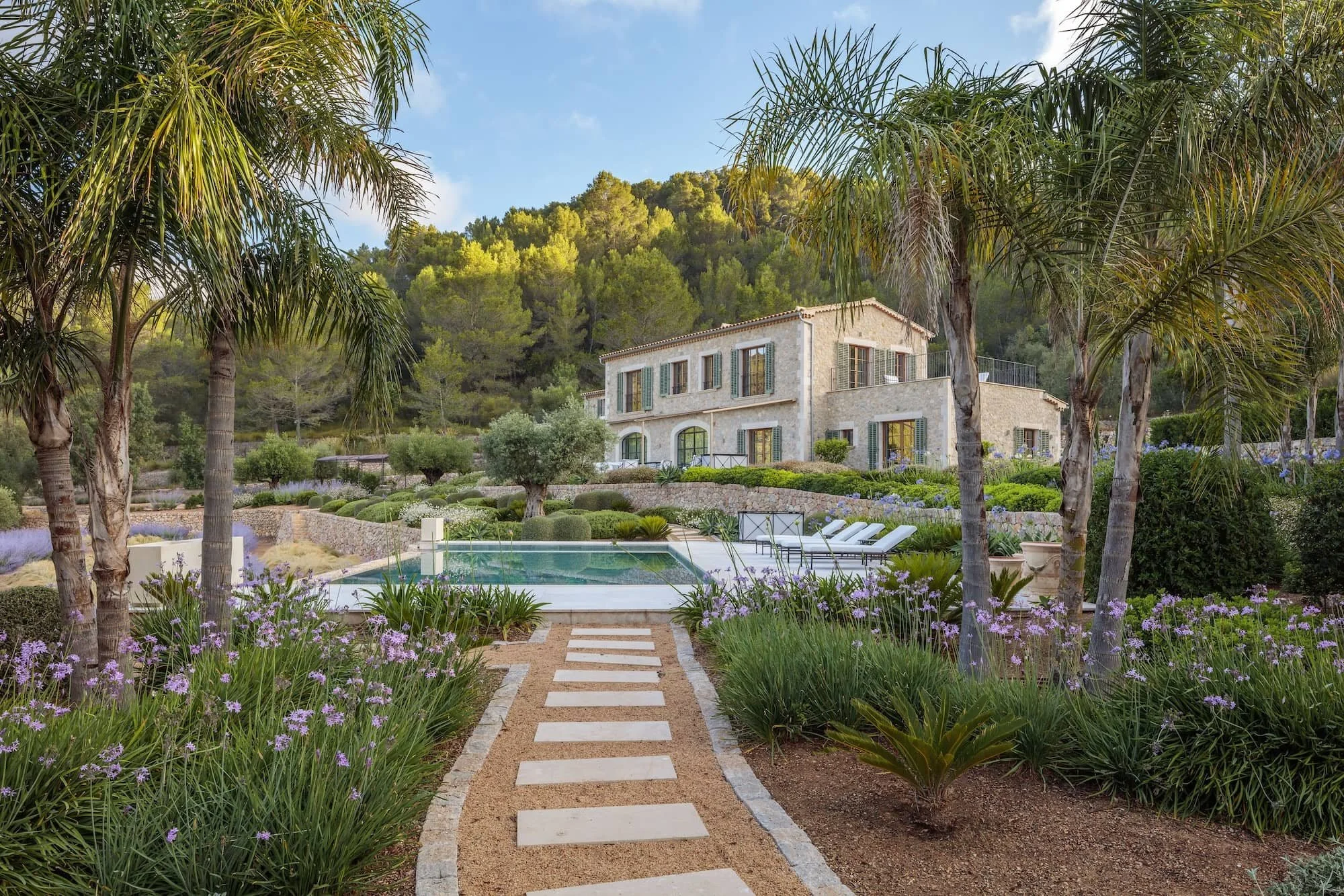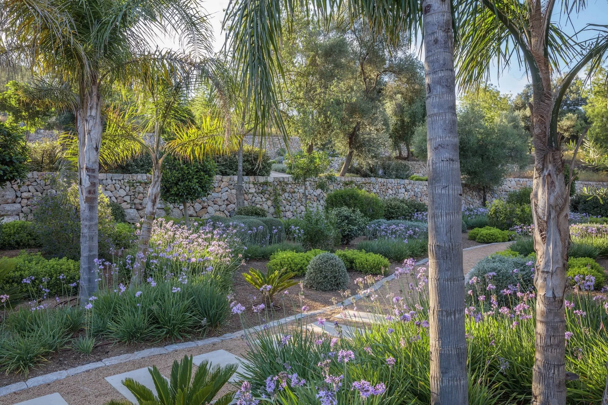 The pool area is its own world. Planted with cycas, agapanthus and tulbaghia, it has a lush, almost tropical feeling — all achieved with species chosen for their resilience to Mallorca's hot, dry summers. Layered and abundant, it's a place designed for long, languid days by the water.